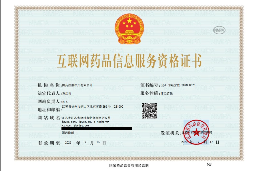 0516-8010-1098 江蘇省徐州市高新技術(shù)開發(fā)區(qū) 北京南路283號萬泰廣場1號樓7-13層 互聯(lián)網(wǎng)藥品信息服務資格證書
